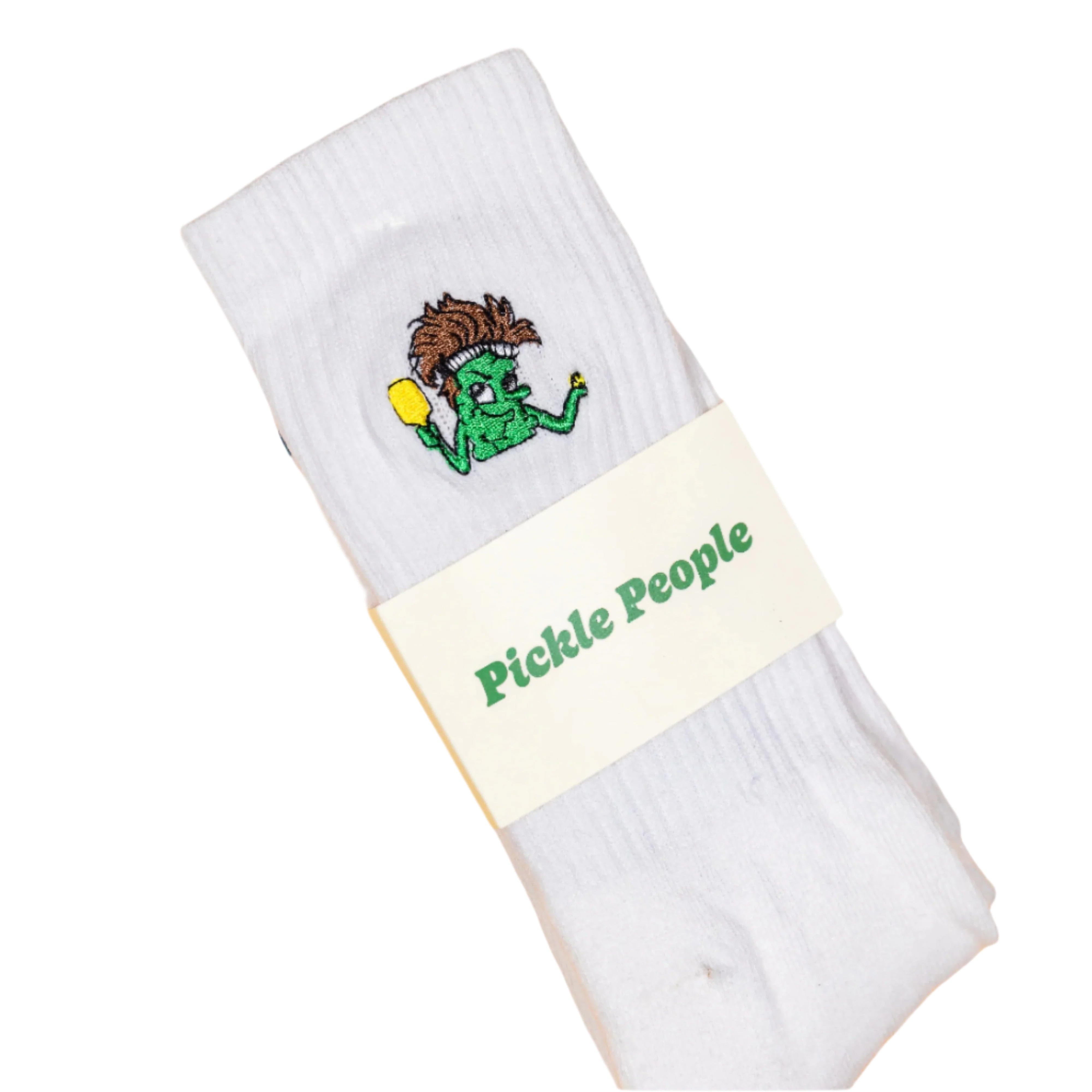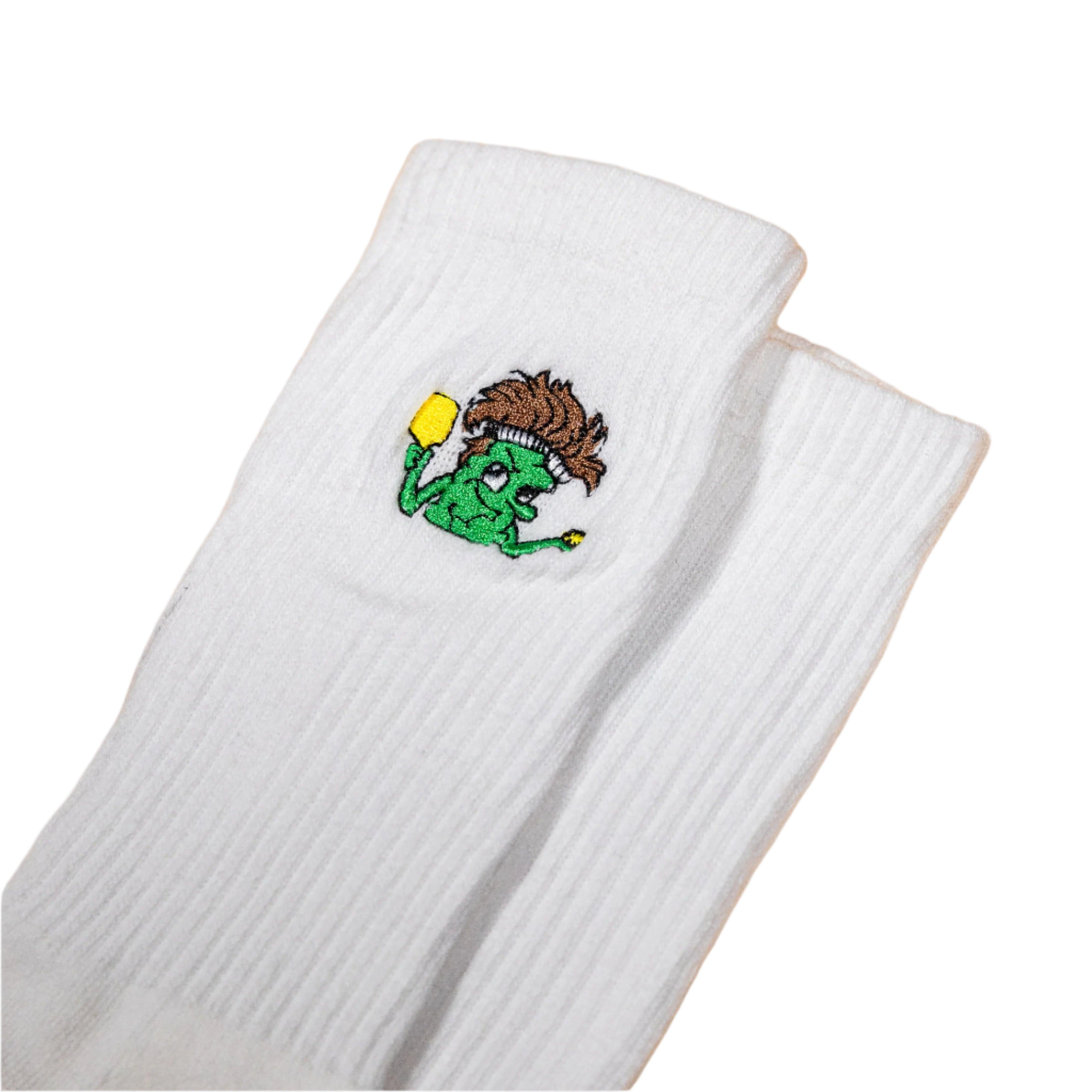 Elevate your sock game with our embroidered Pickle People socks, featuring a bold blue stripe and the beloved Pickle People character, Dillon "Dink-Dink" Greenwald. Experience unparalleled support and cushioning, specifically designed for instant response and seamless integration with any type of terrain.